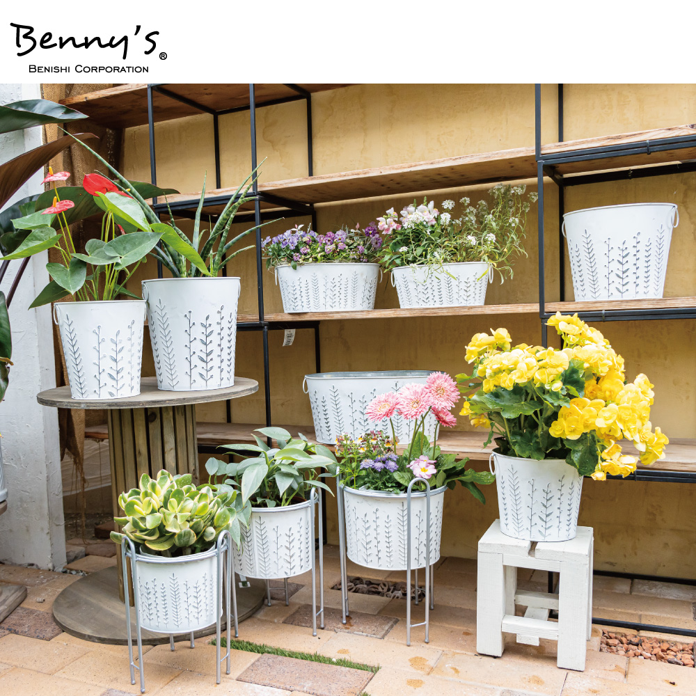 | ナチュラルなリーフ柄のブリキポットに、専用のアイアンスタンドを組み合わせた商品です。 地面から浮かせることで通気性が良くなるだけでなく、アイビーなどの垂れ下がる植物を美しく飾ることができます。 |