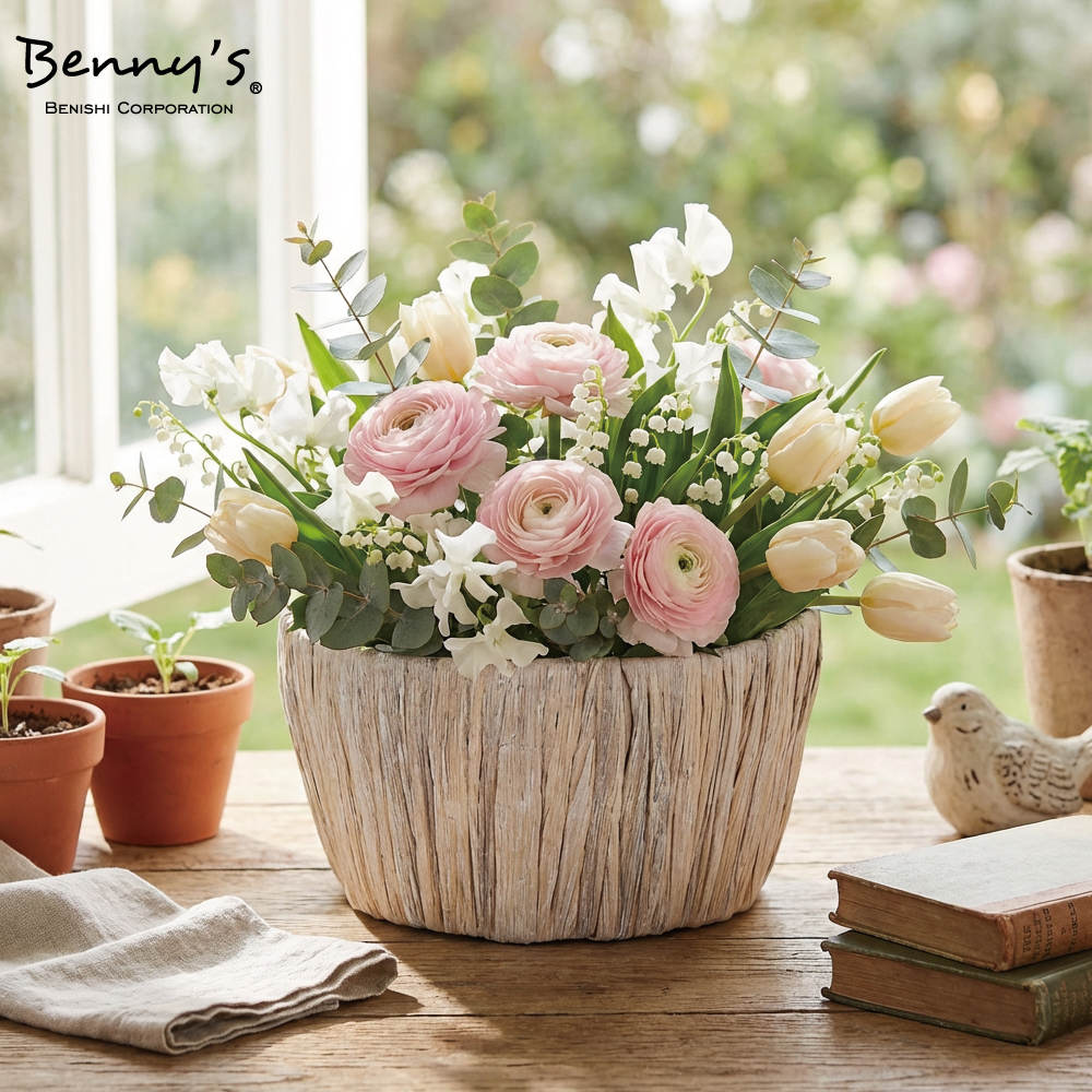 | 天然素材をホワイトウォッシュで仕上げた、素朴で温かみのある風合いのラウンドバスケットです。 丈夫なワイヤーフレーム構造で型崩れしにくく、付属のPETライナー(防水インナー)を使えば生花のアレンジとして便利に使えます。 |