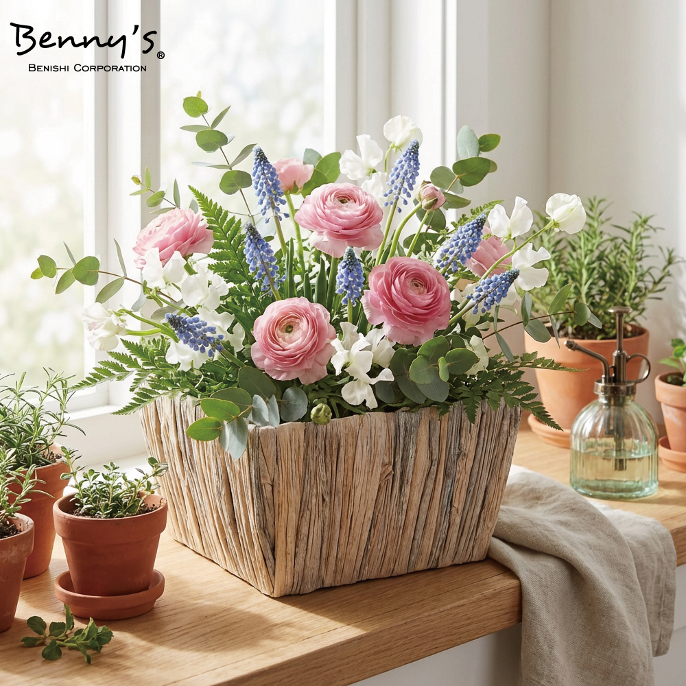 | オアシスをセットしやすい角型で、フラワーアレンジメントの制作効率を上げる実用的なバスケットです。 水漏れを防ぐPETライナー付きのため、生花を活ける器としてそのまま使用でき、ギフト商品作成の定番資材として活躍します。 |