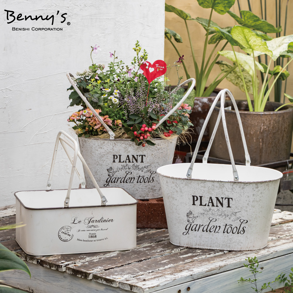 寄せ植えやギフトアレンジに。シャビーな風合いが植物を引き立てるバスケット型ポット