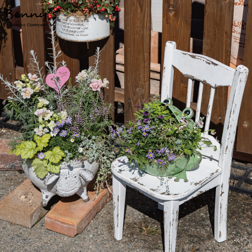 | 長年使い込まれたようなシャビーシックな塗装が魅力的な、ミニチェア型の木製フラワースタンドです。 背もたれ付きのデザインは存在感があり、鉢植えを置くだけで物語のワンシーンのような愛らしいディスプレイが完成します。 |