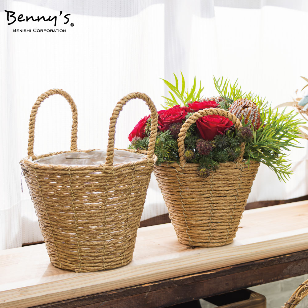 | 明るいナチュラルブラウンの素材を編み込んだ、バケツのようなフォルムが可愛いハンドル付きバスケットです。 どんな植物とも相性が良く、リビングや玄関に無造作に置くだけでナチュラルな空間を演出します。 |